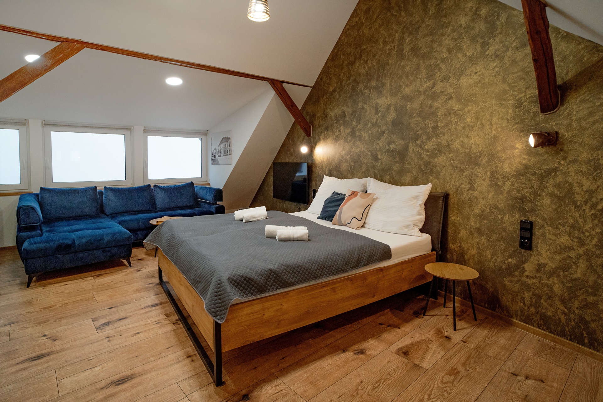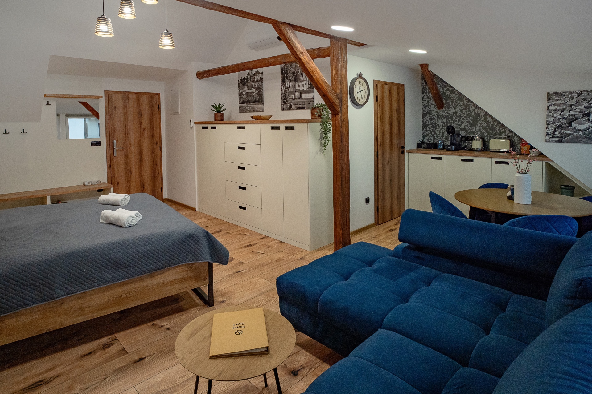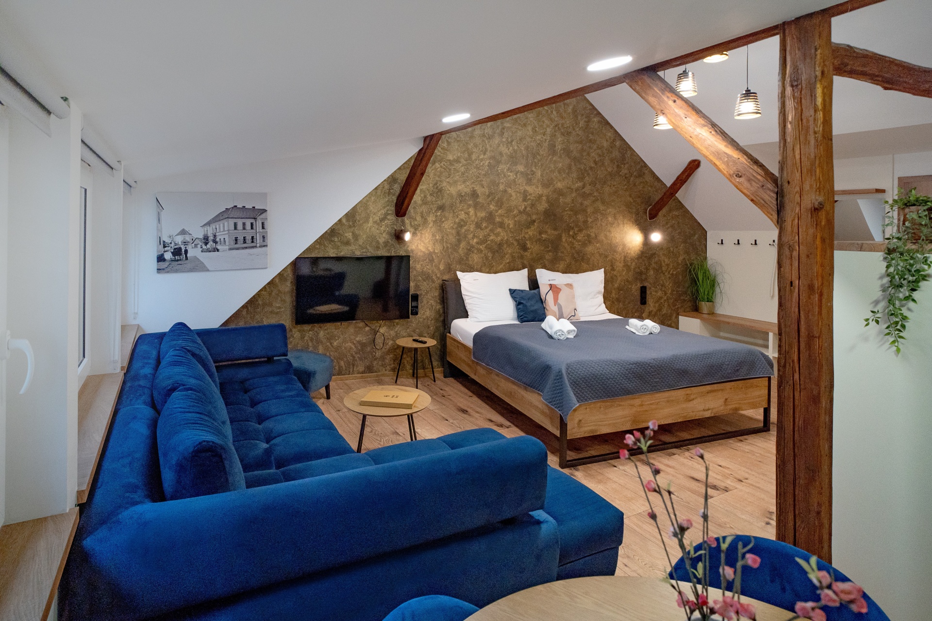 Podkrovní apartmán o velikosti 36,75 m² s manželskou postelí, rozkládací pohovkou a možností přidání dětské postýlky.