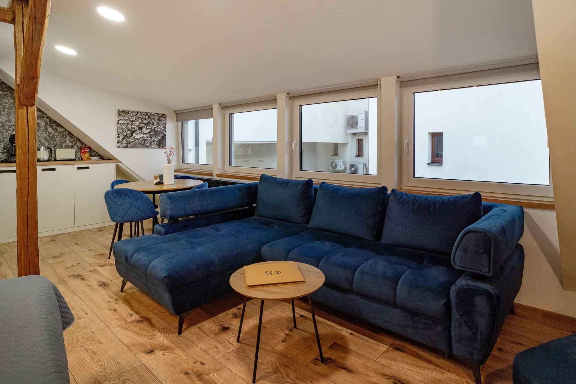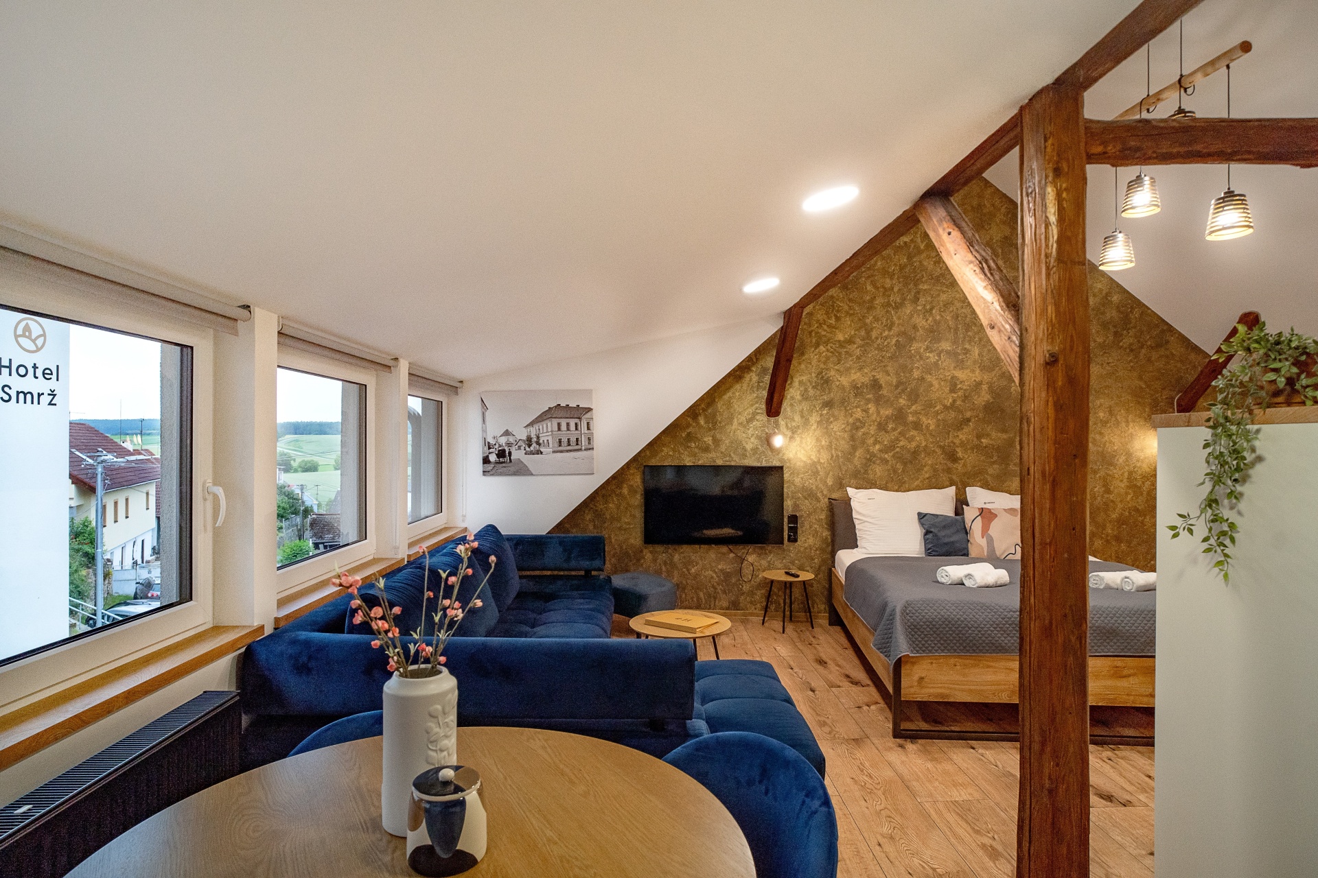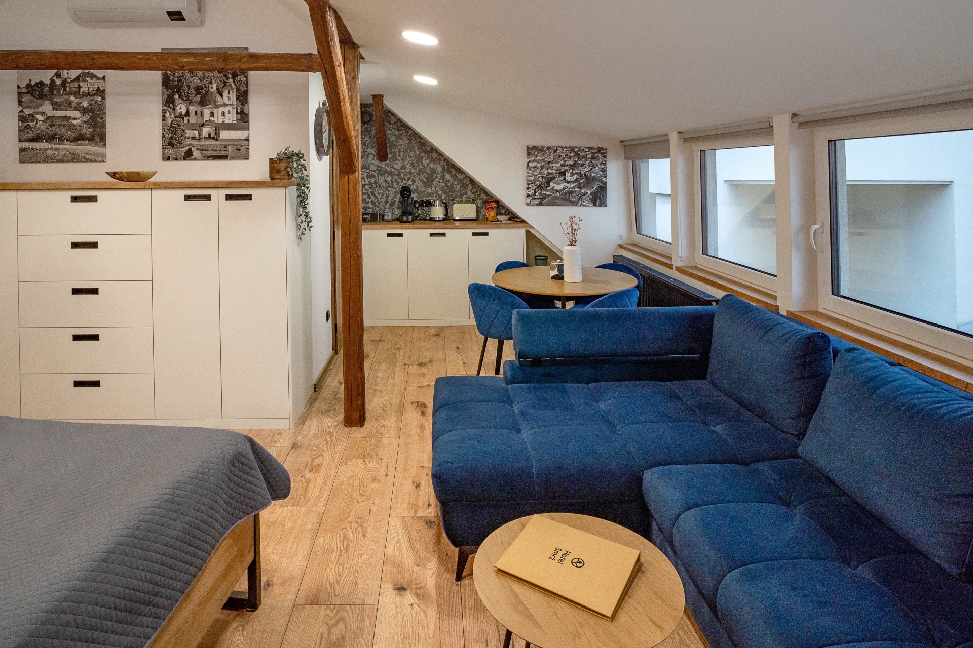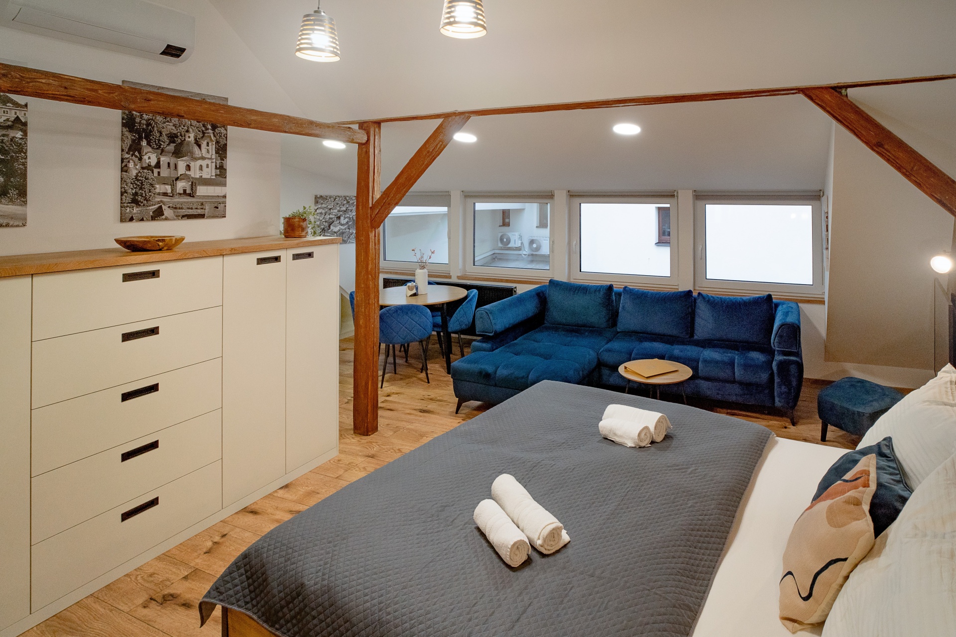 Podkrovní apartmán o velikosti 36,75 m² s manželskou postelí, rozkládací pohovkou a možností přidání dětské postýlky.